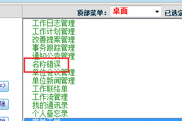 :点晴OA设置自定义桌面和菜单显示模块时出现名称错误是怎么回事?如何解决?![]() ![]() 出现名称错误提示的功能是升级后有新增功能模块导致的,将“名称错误”的菜单删除,重新添加需要加入的菜单即可。