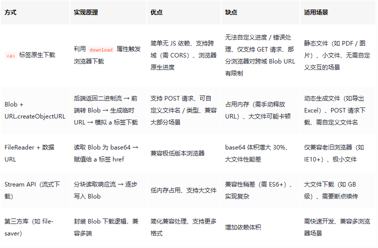 前端下载文件是常见需求,不同场景(如静态文件、动态生成文件、大文件、跨域文件)对应不同最佳实践,核心目标是稳定性、用户体验、兼容性。以下是系统化的最佳实践方案: 一、核心下载方式对比与适用场景 二、基础场景最佳实践1.静态文件下载(最简单)直接使用<a>标签,核心是download属性(指定文件名,可选):<!...