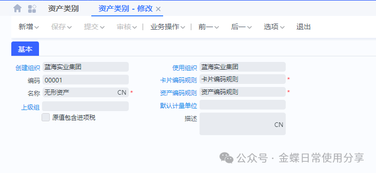 【概述】无形资产可以在固定资产模块处理。因为无形资产和固定资产的摊销政策不一样,所以需要单独新增无形资产的资产类别和折旧政策来区分,后续计提折旧生成凭证和资产期末结账的操作方式和固定资产的操作方式一致。【操作步骤】1.在【固定资产】→【资产类别】中新增资产类别为“无形资产“;2.在【固定资产】→【折旧政策】中新增无形资...
