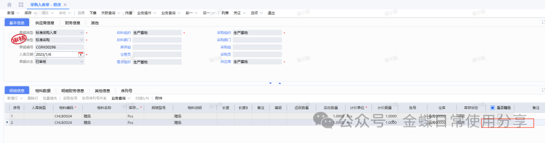 【概述】采购、销售等业务中存在赠品业务,在金蝶云星空产品中有多种业务流程处理:场景1、同一物料存在正常采购入库和赠品采购入库两种情况,同期存在出库业务:采购入库如下,赠品行勾选了“是否赠品”选项,库存状态为“可用”:销售出库如下,赠品行勾选了“是否赠品”:存货核算后,由于该物料既有正常采购业务,又有赠品业务的情况下,同...