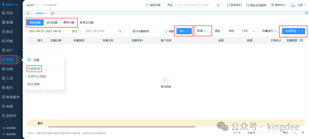 精斗云云会计更新升级后,在账套左侧功能栏里面多了一个【发票】模块,鼠标放到发票模块上,点击【发票管理】在发票管理中,目前支持销项发票、进项发票和费用小票的录入,录入的方式有【导入】和【新增】两种,导入又分为发票识别导入和税控平台文件导入;发票识别即将发票图片上传识别相关数据,而税控平台文件导入顾名思义是将数控平台里的...