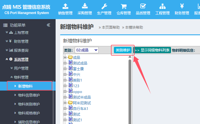 【点晴模切ERP】如何增加或维护物料大类类别和子类类别信息?​ 进入点晴ERP子系统-》系统管理-》物料管理-》新增物料(需要有此页面操作权限):一、新增物料大类类别点击页面上的“类别维护”按钮:如果是需要增加新的物料大类,那么直接在右边输入新的物料类别信息即可,注意上面红色框中内容,此时必须是“新增类别”,填写具体...