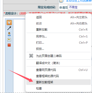 用谷歌浏览器打开流程设计还是没有显示,要如何解决?可能是工作流流程太复杂、网速太慢等原因,导致未成功加载工作流流程。解决方法:在流程设计页面,点击鼠标右键,选择“重新加载框架”,按道理点击后就会看到完整的正常流程图了:如果反复多次点击了重新加载框架,还是无法显示流程图,那就是流程图代码损坏了,只能作废当前有问题的流程,...