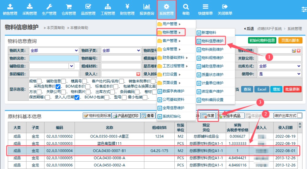操作步骤:系统管理——物料管理——物料信息维护;进入页面后如下图操作: 点击编辑进入修改页面;修改后点击提交即可,修改页面如下图所示: