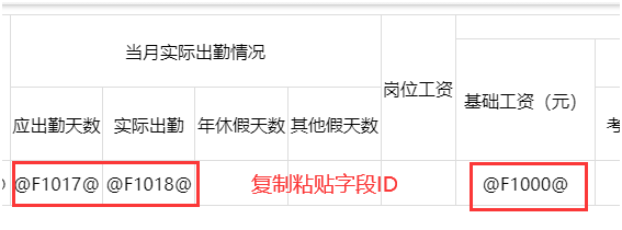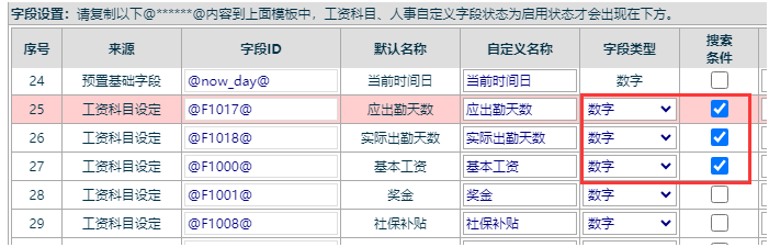 在字段下方设置中找到需要的字段,调整字段类型,勾选启用搜索条件,复制字段ID@***@到模板中,字段ID表示数据信息显示的位置,excel导入的数据也会保存在该字段内。