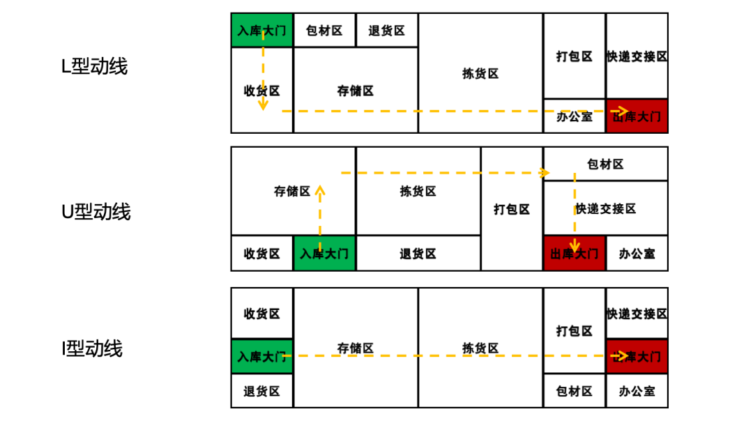 仓库主动线的设计是整个仓储物流中心运行的基础,实操中常使用的仓库动线有以下三种类型: