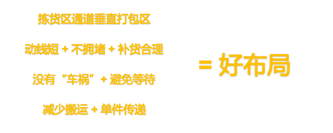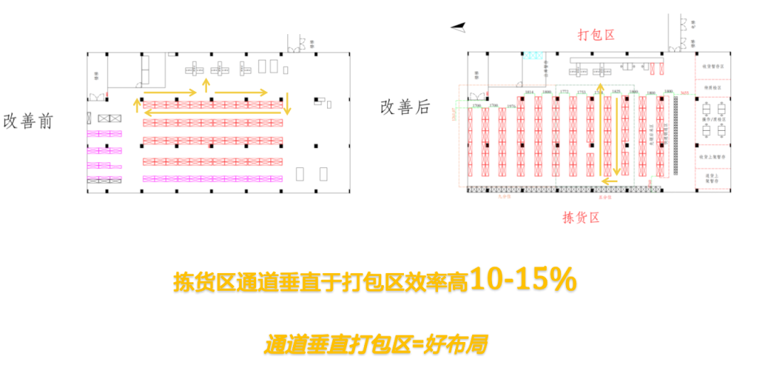 这里需要特别提醒仓库管理者在设计通道的时候,尤其要注意拣货通道的设计朝向,经过数据测算,拣货通道垂直于打包区为最佳通道朝向。