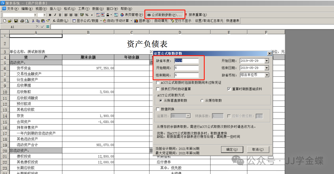 以资产负债表为例,如果要查询去年的数据,在查询时,先通过【工具】--【公式取数参数】。需要注意的是,上述缺省年度、期间一般默认值为0,表示当前账套的会计期间。