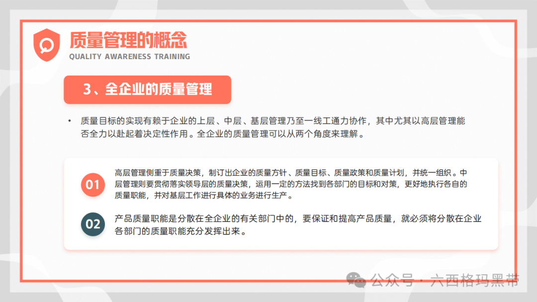 2. 全员参与:质量管理不仅仅是质量部门或质检人员的责任,而是需要全体员工的共同参与。每个员工都应该具备质量意识,关注自己工作的质量,并积极参与质量改进活动。