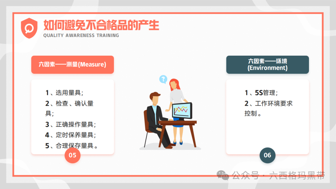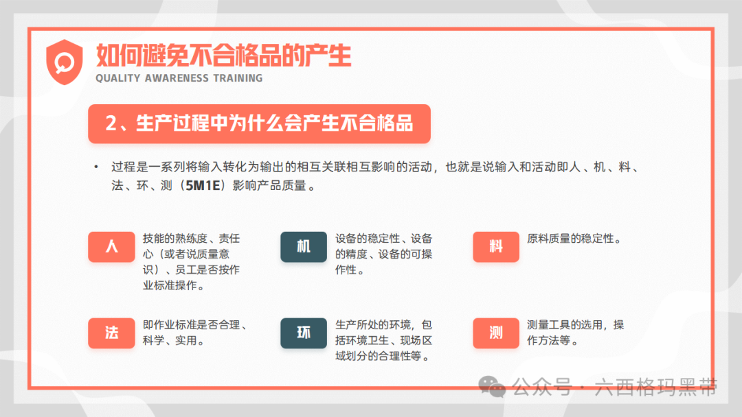 为了有效避免不合格品的产生,企业需要严格控制生产过程中的六大因素:人(操作人员)、机(设备)、料(原材料)、法(工艺方法)、环(环境)、测(测量)。通过加强对这些因素的监控和管理,可以及时发现并纠正潜在的质量问题,确保产品质量的稳定性。