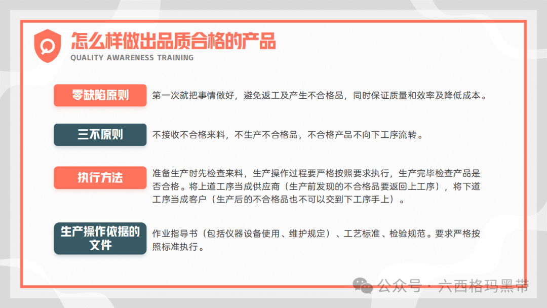 零缺陷原则强调“第一次就把事情做好”,即要求员工在生产过程中严格遵守质量标准,确保每个环节都不出错。这一原则要求员工具备高度的责任心和敬业精神,以零缺陷为目标,不断提升自己的技能水平。