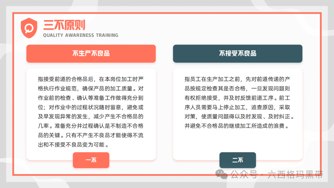 • 二不:不接受不良品。员工在接收来料或上一道工序的产品时,应进行严格的检查,对不合格品进行及时拦截和处理。