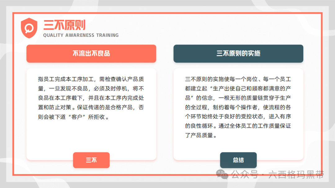 • 三不:不流出不良品。员工应确保自己生产的产品在流转至下一道工序或市场前,已经过全面的检查和验证,确保产品质量的合格性。