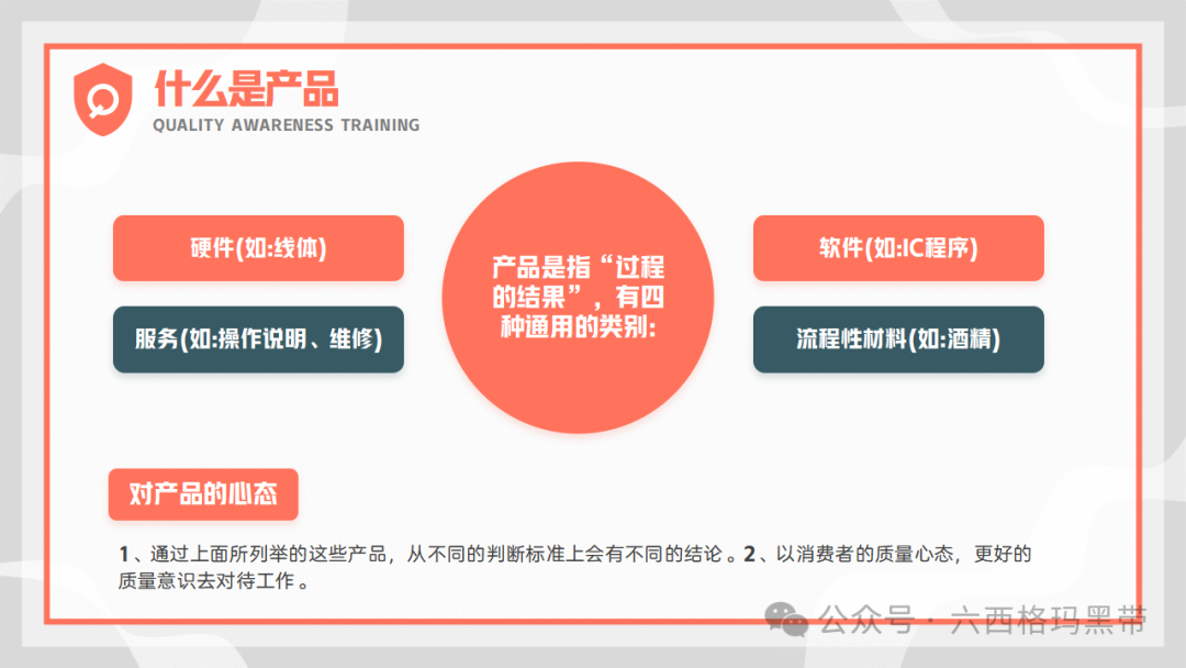 产品是指经过生产、加工、制造等过程而得到的具有特定形状、性能、用途和价值的物品。在质量管理中,产品不仅指最终的成品,还包括生产过程中的半成品、原材料等。