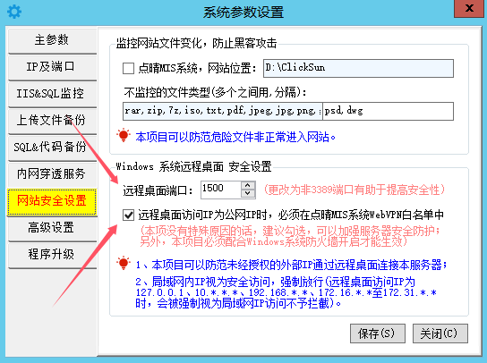 点晴MIS信息通后台程序直接更改服务器远程桌面端口,并设置非WebVPN白名单IP的外部电脑禁止连接远程桌面