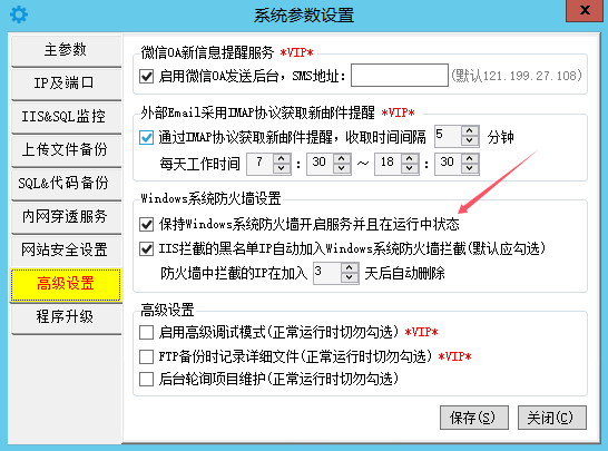 在高级设置中,勾选“接管Windows系统防火墙开关管理(并设置为开启防火墙)”、“IIS拦截的黑名单IP自动加入Windows系统防火墙拦截”,然后点击“保存”。 特别强调:如果服务器上同时安装了多套点晴MIS系统,那么只需要在其中一个后台程序中勾选这两个选项“接管Windows系统防火墙开关管理(并设置为开启防火墙)”、“IIS拦截的黑名单IP自动加入Windows系统防火墙拦截”即可,其他后台程序切勿勾选这两个选项,否则会导致本功能陷入混乱中。 附加说明: