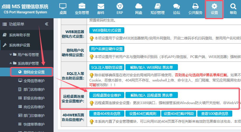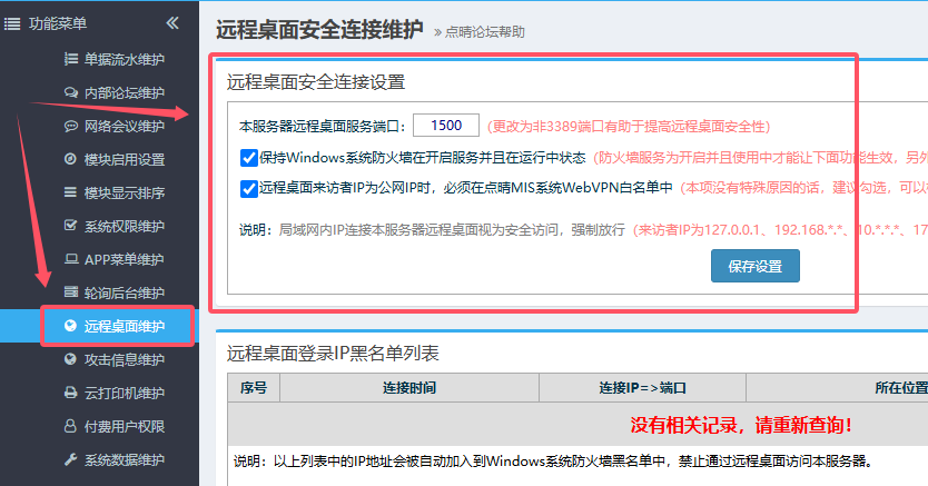 在此页面上面直接更改远程桌面服务端口、设置保持Windows系统防火墙开启服务状态、启用点晴MIS信息通后台服务程序是否启用以上防范功能,效果和点晴MIS信息通后台服务程序中的相应设置是完全一样的。 二、外部电脑无法访问点晴MIS系统服务器远程桌面时,如何解除IP地址封锁? 加入到Window系统防火墙黑名单的IP地址,虽然无法访问服务器的远程桌面,但不影响正常访问服务器网站,管理员可以登录点晴MIS系统(必须以管理员身份登录),在如下位置解除封锁: 进入设置->系统安全设置-》系统维护管理,找到菜单“登录安全设置”,找到如下位置“远程桌面连接安全设置维护”(同上),点击进入: