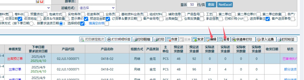 进入送货单明细管理,选择需要修改单价的送货单。已经发货的送货单点击“查看”,未发货的送货单点击“查看”或者“编辑”按钮。