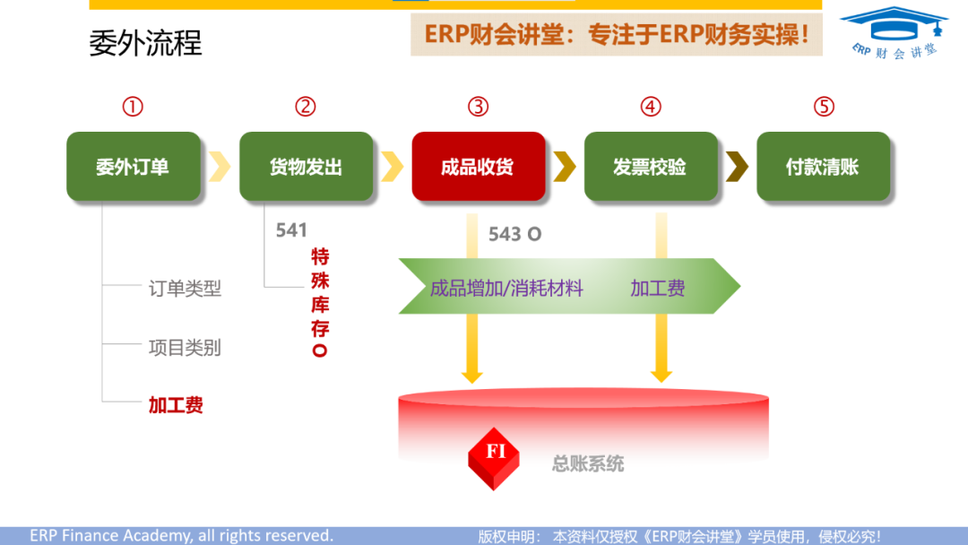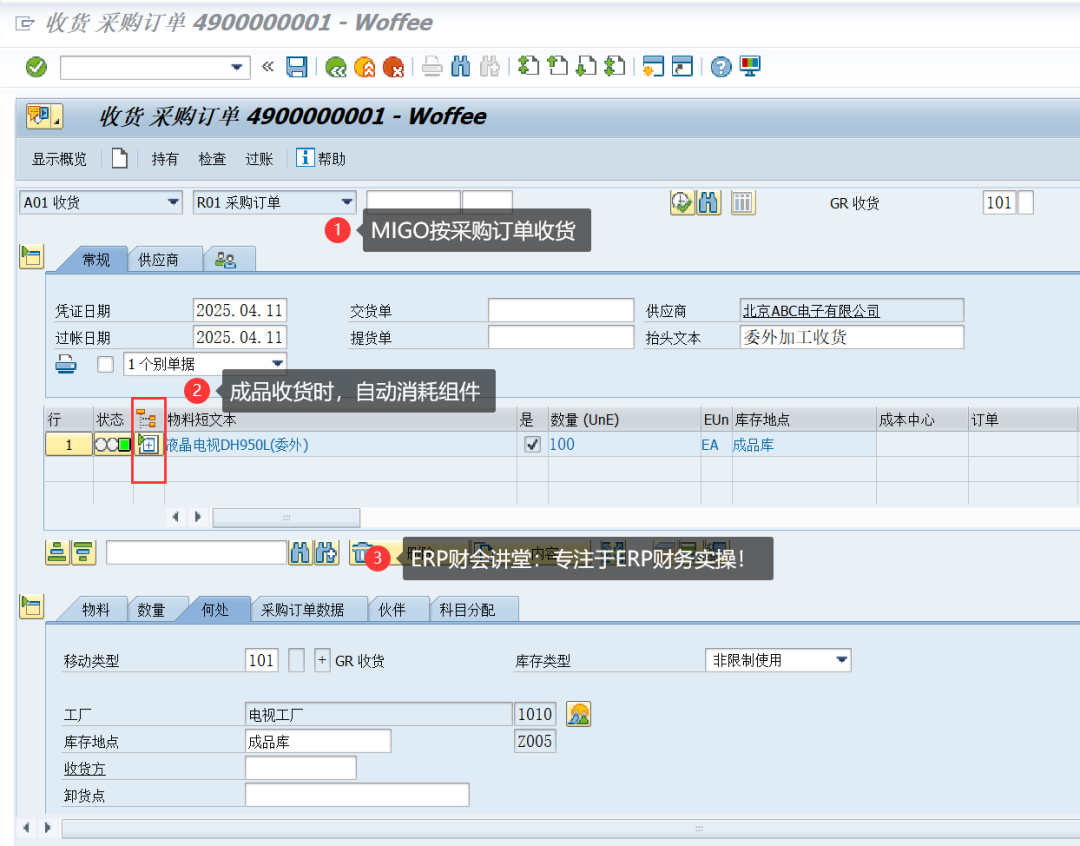 第三步,成品收货。加工商生产完成后,将成品发给我方,我方收货。MIGO按采购订单收货,无需特别操作。