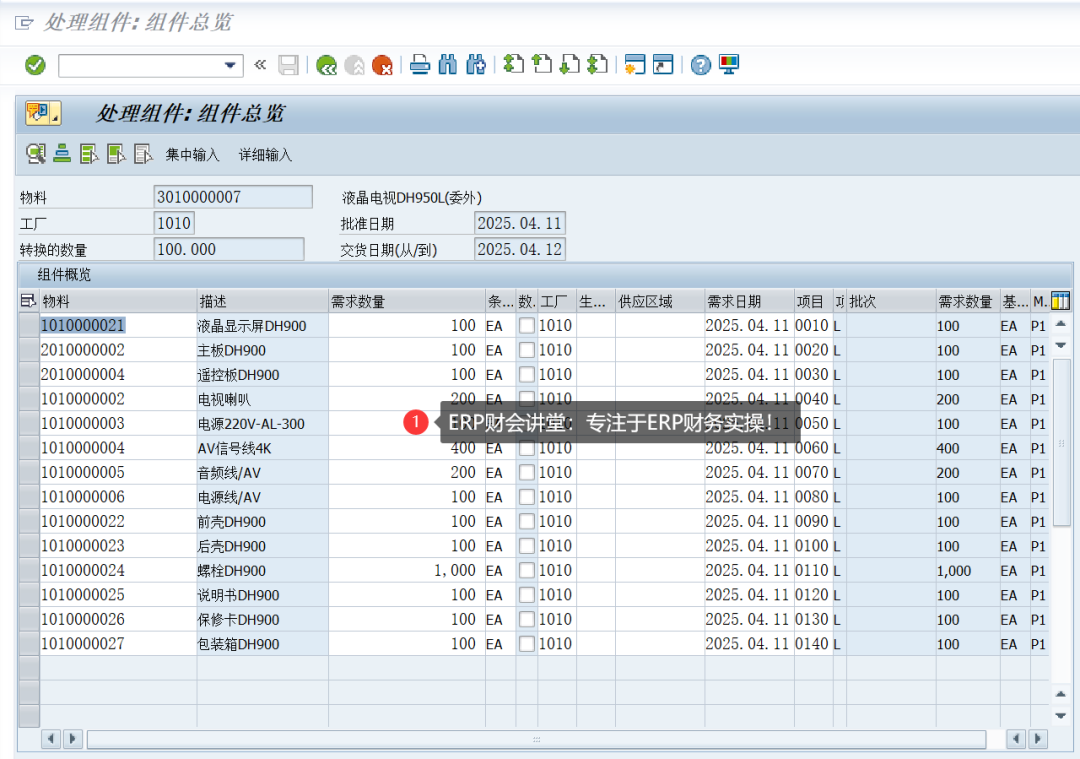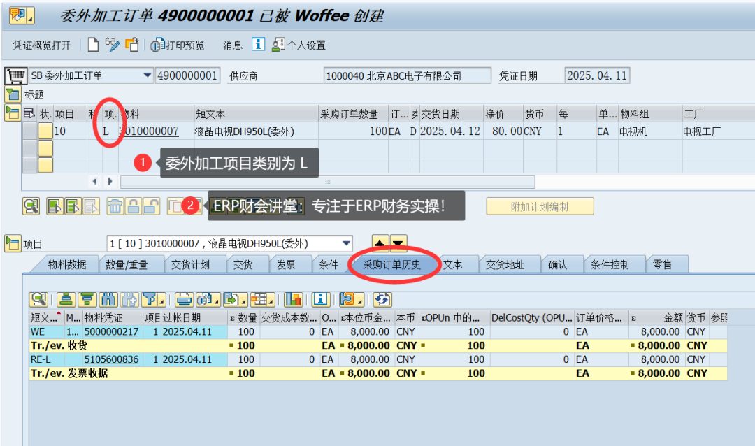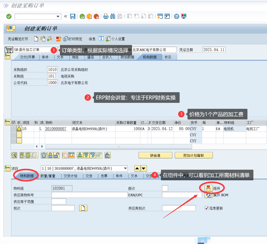 说明:标准委外订单,就是采购订单,创建时项目类别选择“L”,表示委外采购。在项目的“物料数据”中,可以看到加工所需的组件,即需要提供给供应商的材料。
