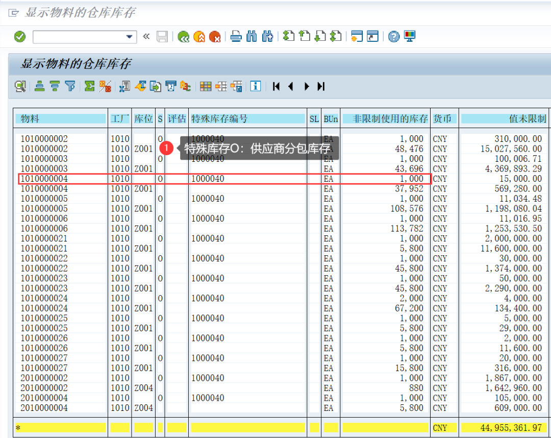 将材料发给分包商,移动类型为541,在系统中相当于将库存进行区分,实际上所有权还是属于我方。保存后,查询物料库存如下。