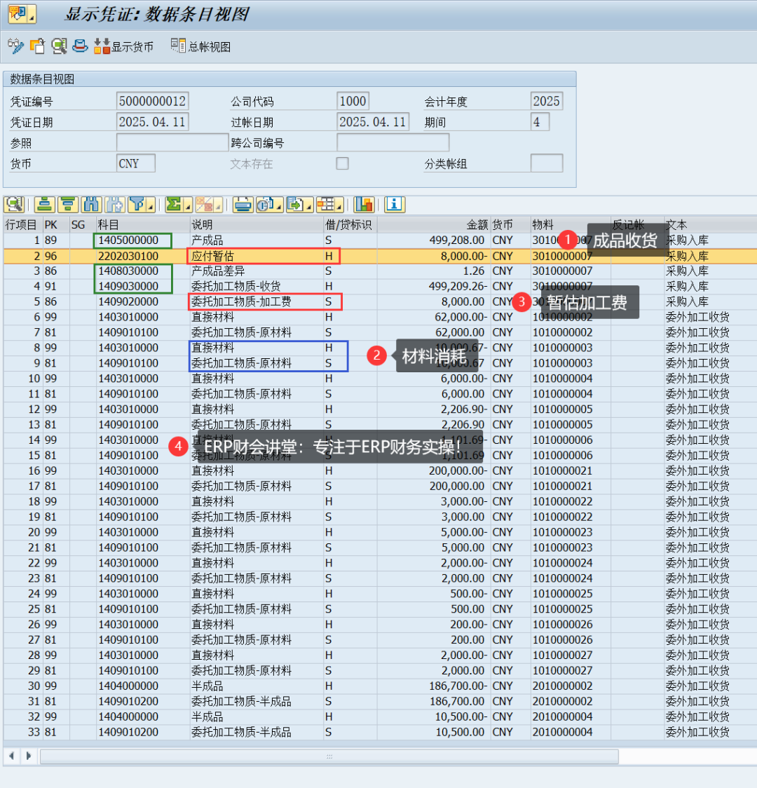 委外采购订单收货,会产生如下影响:1、成品入库;2、特殊库存消耗;3、暂估加工费。查看收货对应的会计凭证如下,