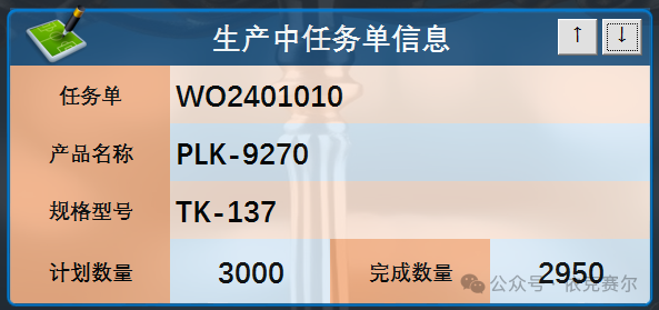 2.1 生产中任务单信息:看板中心位置显示生产中的任务单信息,可通过右上方的向上和向下按钮切换查看。当前信息支持自动循环播放。