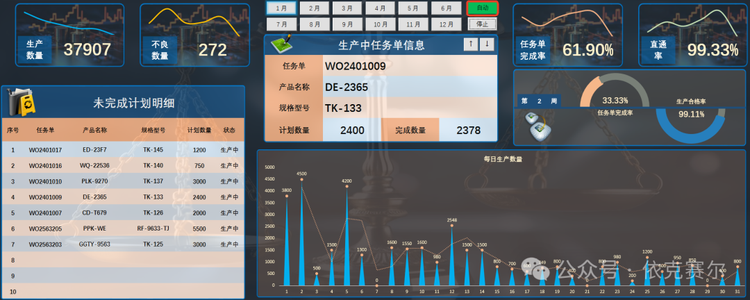 生产数据可视化看板3.5:生产数据可视化看板是一种直观、高效的工具,旨在帮助企业实时监控和分析生产过程中的关键数据。通过将复杂的生产数据转化为图表、动态图形,管理者能够快速掌握生产线的运行状态、设备效率、产品质量以及资源消耗等核心指标。看板支持多维度数据分析,帮助识别生产瓶颈、优化资源配置、提升生产效率,并支持决策制定。无论是实时监控还是历史数据回溯,生产数据可视化看板都能为企业提供清晰、 actionable 的洞察,助力实现智能制造和精益生产的目标。本期分享的生产数据可视化看板主要用于生产数据的实施更新和展示,并能实现一键循环展示生产任务状态以及相关的生产数据等信息。