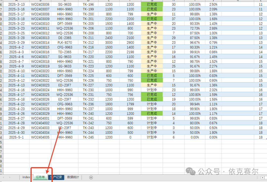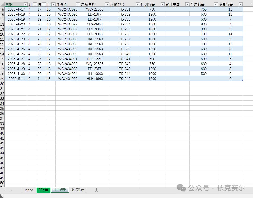 5 生产记录:生产数据更新,在生产记录的工作表录入对应信息即可。