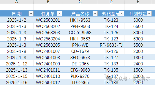 4、任务单:新增任务单,只需要在任务单的工作表输入对应的任务单信息即可。任务单信息只需要输入日期、任务单、产品名称、规格型号和计划数量和状态即可,其他信息均可通过公式自动获取