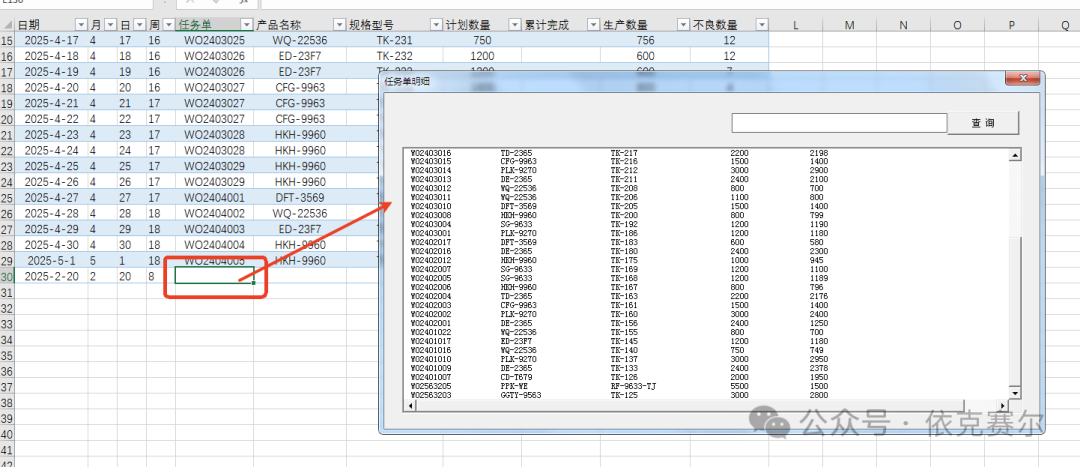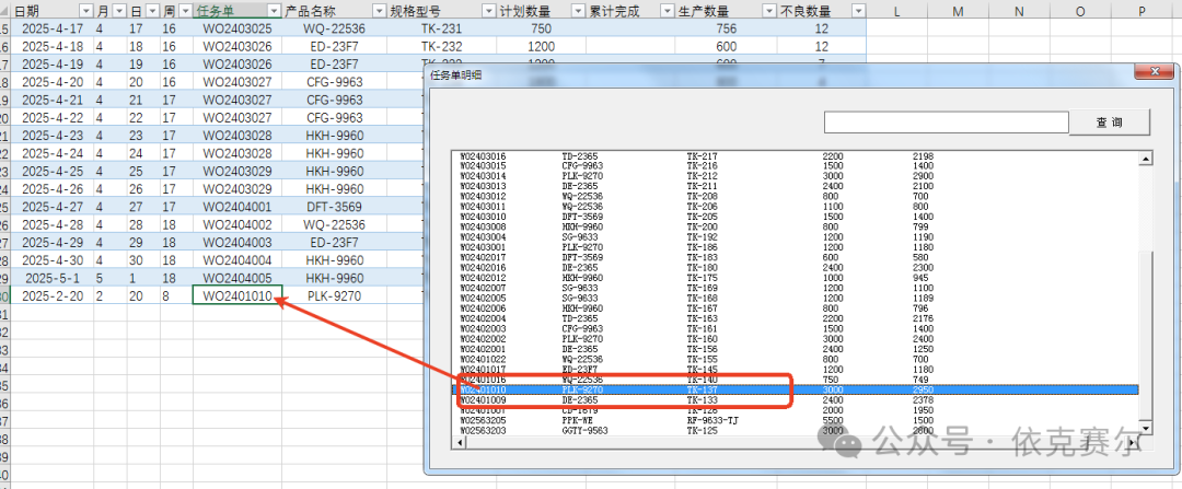 5.2任务单信息:在任务单列双击空白单元格,可打开任务单信息选择窗口,双击需要录入放入的任务单信息后,自动添加到任务单信息录入位置。只需要输入生产数量和不良数量即可更新图表。