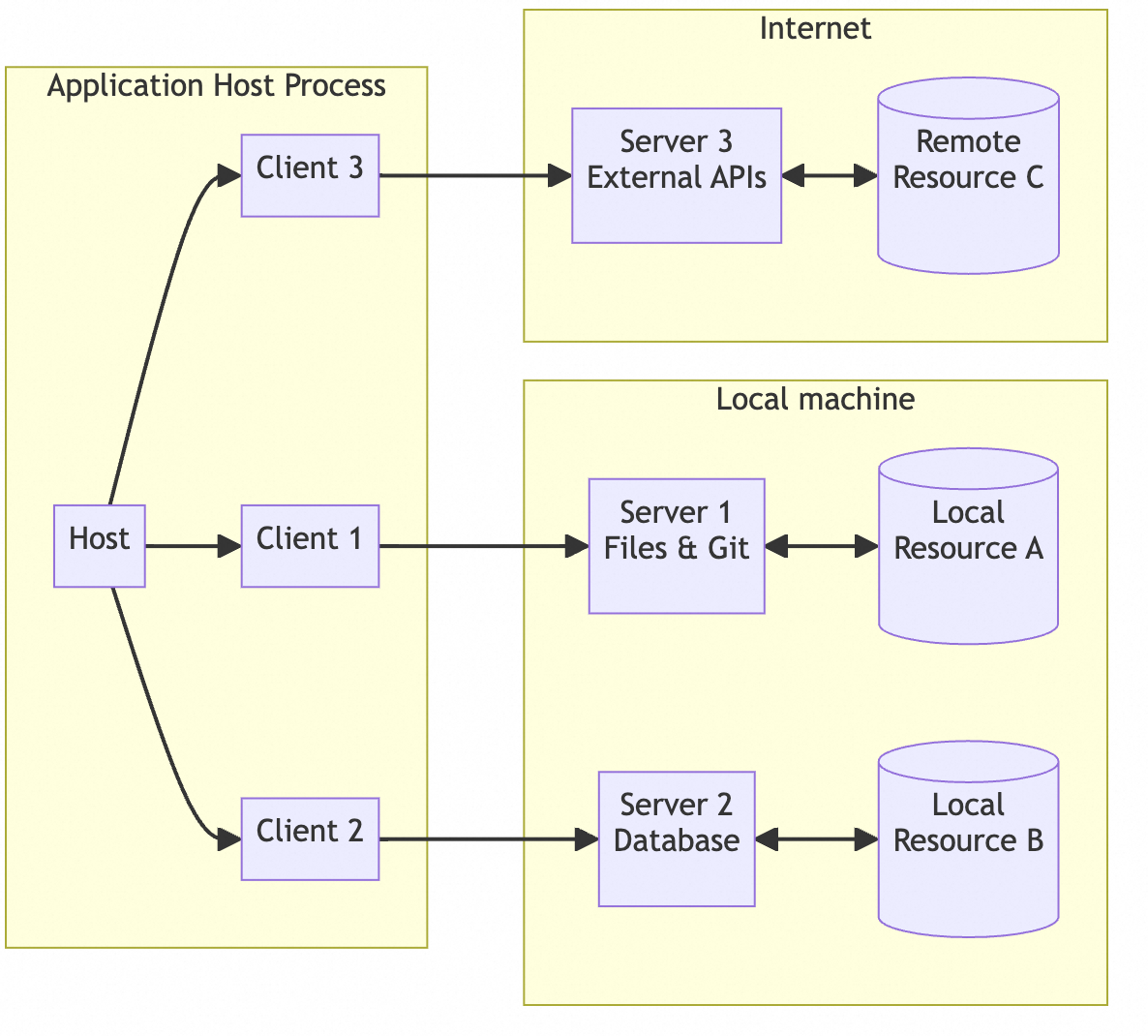 这里需要注意的是MCP Client与MCP Host(主机)并不是分离的部分,但为了时序图清晰,这里将其逻辑上拆分为不同的部分,实际上MCP Host可以理解为我们需要嵌入AI的应用程序,例如 CRM 系统或 SaaS 服务,实际上Host中是包含MCP Client的代码。实际的 MCP Host 与 Client 结构如下图所示:
