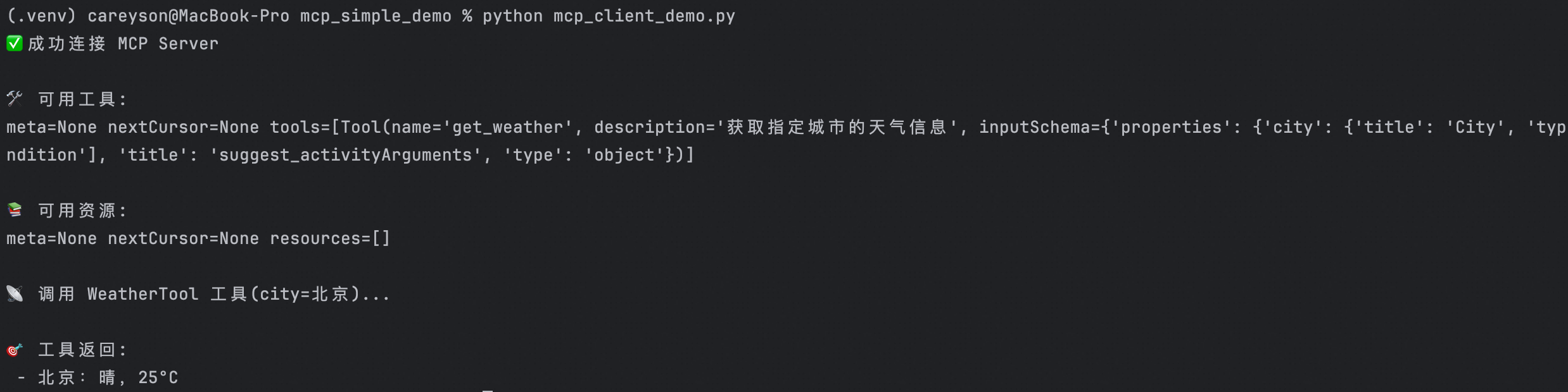 可以看到,MCP 服务器既完成了实际的数据获取,又把结果封装成统一格式返回给MCP Host。整个过程对于 LLM 和客户端来说是透明的:他们不需要关心天气数据具体来自哪个数据库或API,只需通过 MCP 协议与服务器交互即可。这体现了 MCP 模块化的设计理念——Tool的实现细节被封装在MCP Server中,对外提供标准接口。