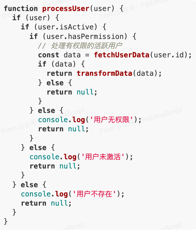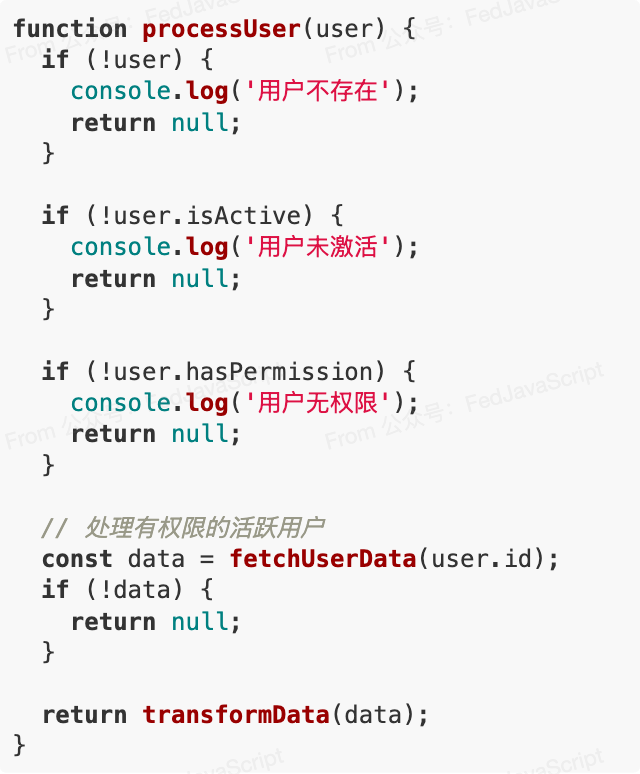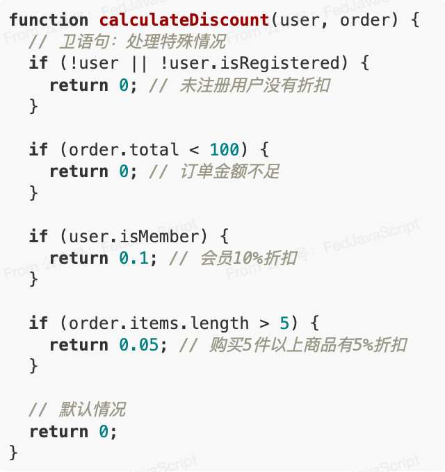 这种使用return提前退出的方式也被称为"卫语句"(Guard Clauses)模式。它的核心思想是:先处理所有特殊情况和边界条件,然后再处理主要逻辑。