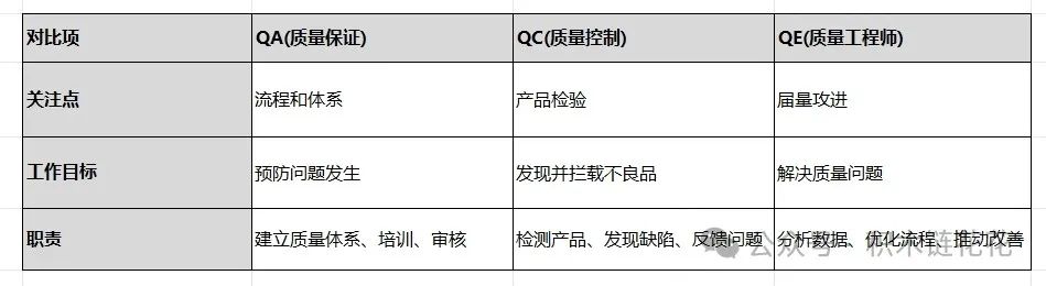 在质量管理的过程中,QA(质量保证)、QC(质量控制)和QE(质量工程)是三个核心角色。它们的工作内容不同,但又密切配合,共同确保产品质量。