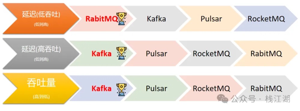 而在高吞吐量的情况下,不同的消息队列系统的响应时间会受到它们设计和优化的影响。响应时间从快到慢的一般排名: