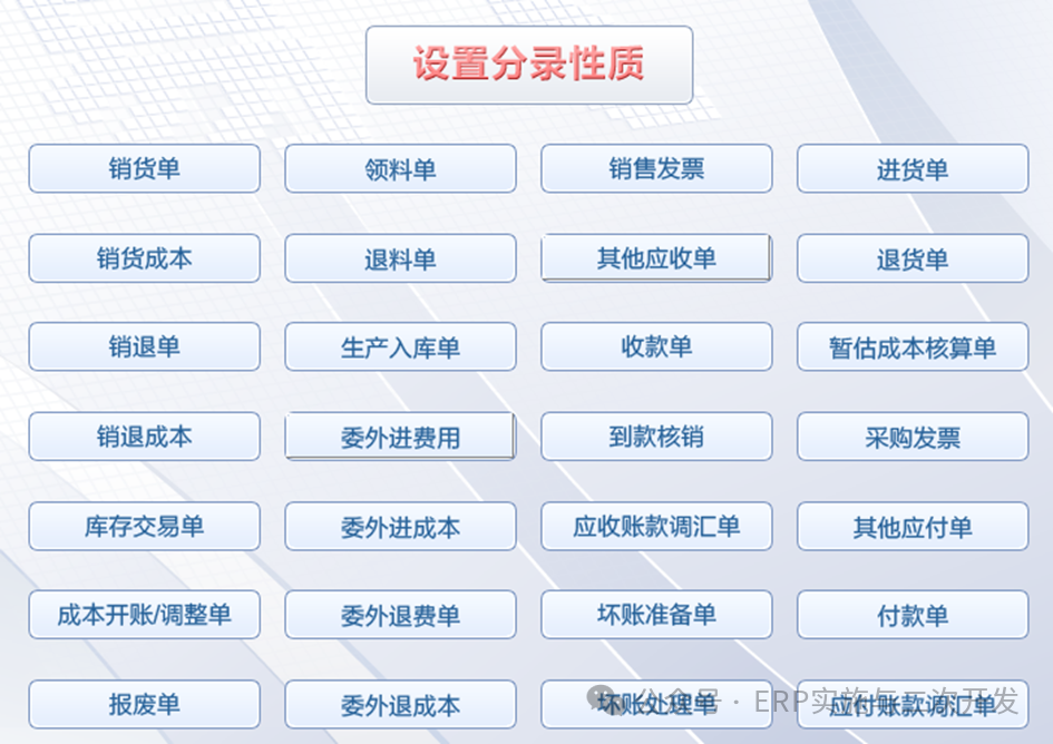 单别/单据性质 | 可根据单别定义不同权限、流程和 单据审批等 | 作为单据和报表筛选条件 |