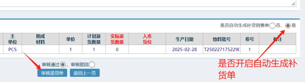 ​审核时注意是否要自动生成补货单,最后点击审核退货单按钮