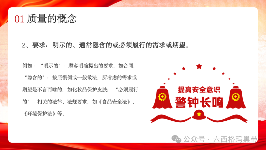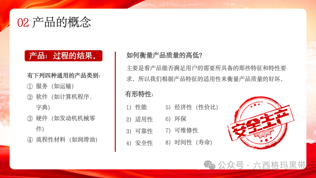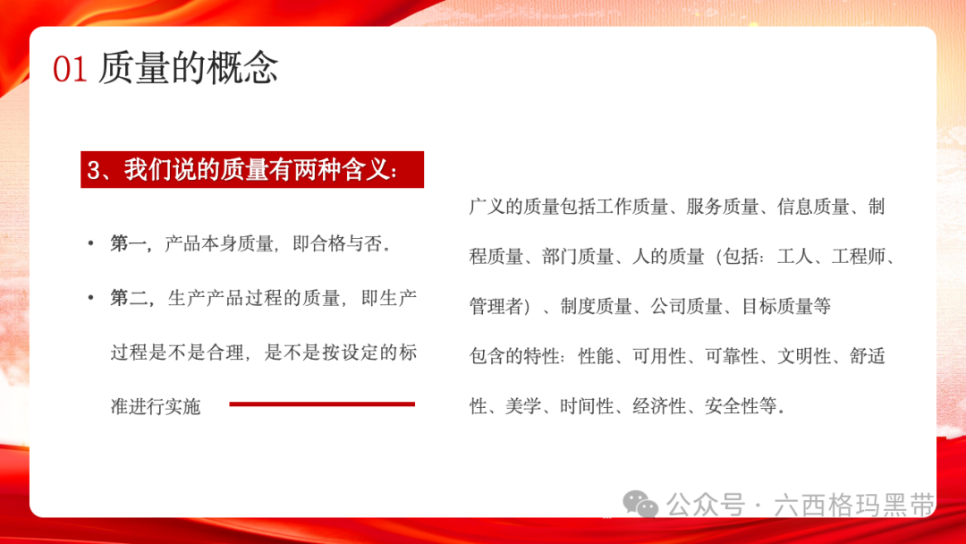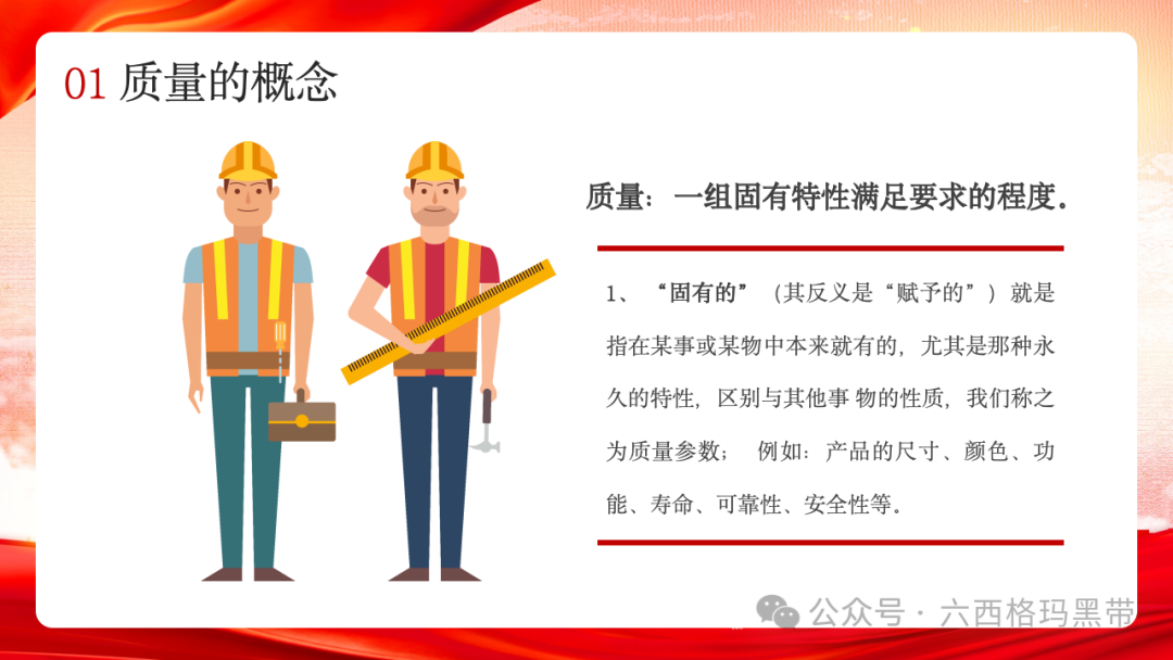 质量的概念质量的定义质量并非是一个抽象的概念,而是可以通过具体特性来衡量的。它被定义为“一组固有特性满足要求的程度”。这意味着,质量不仅仅是产品的好坏,更是一个系统性的问题,涉及到产品从设计、生产到交付的每一个环节。例如,一款智能手机的质量,不仅取决于它的硬件性能,如处理器速度、摄像头像素等,还涉及到软件的稳定性、用户体验的舒适性以及售后服务的及时性等多个方面。