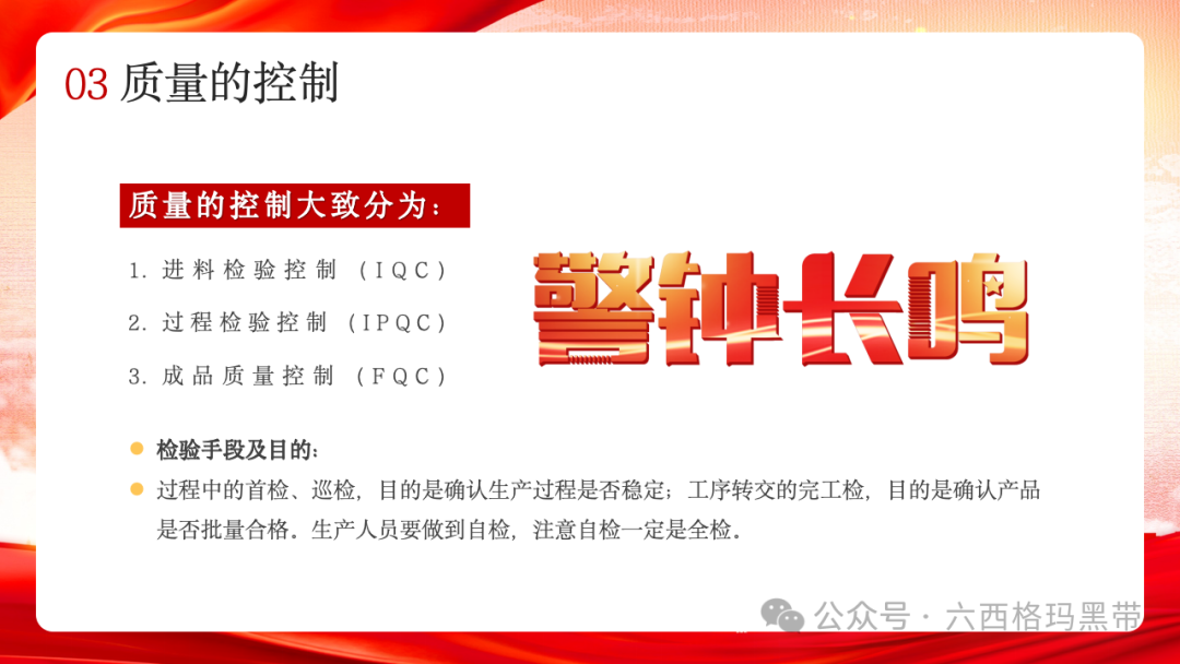 质量的控制质量控制是确保产品质量符合要求的重要手段。通过有效的质量控制,企业可以及时发现和纠正质量问题,减少次品率,提高客户满意度。 检验手段及目的质量控制的检验手段主要包括首检、巡检和完工检。