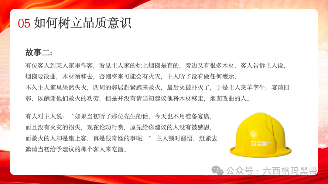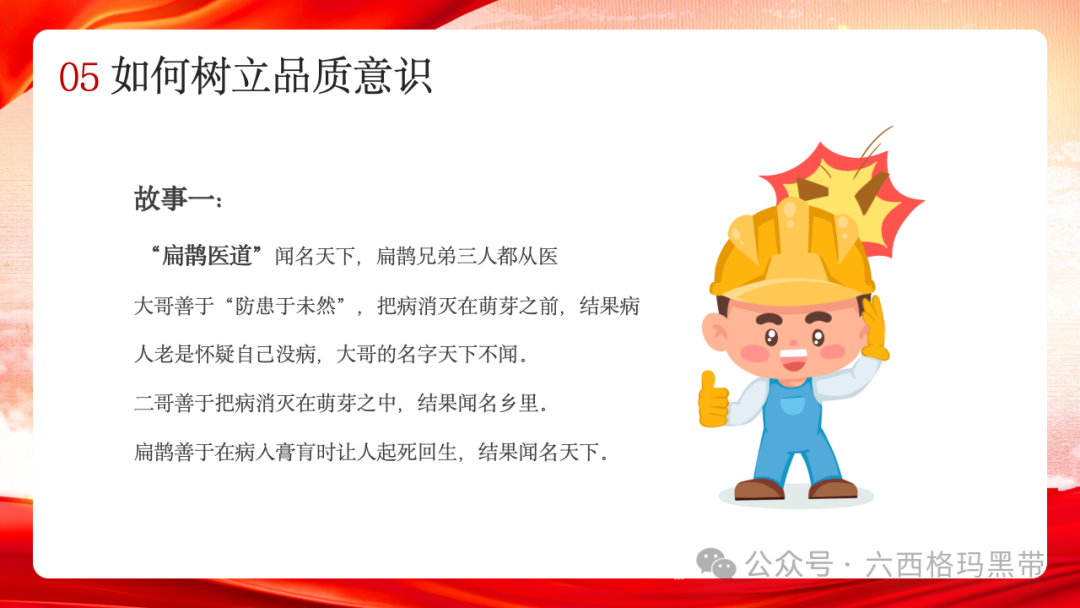 如何树立品质意识树立品质意识是企业质量管理工作的重要目标。通过树立品质意识,企业可以提高员工的质量管理水平,减少质量问题的发生,提高客户满意度。 故事启示在培训中,我们通过一个故事来启发员工树立品质意识。故事内容如下: 有人对主人说:“如果当初听了那位先生的话,今天也不用准备宴席,而且没有火灾的损失,现在论功行赏,原先给你建议的人没有被感恩,而救火的人却是座上客,真是很奇怪的事呢!”主人顿时醒悟,赶紧去邀请当初给予建议的那个客人来吃酒。