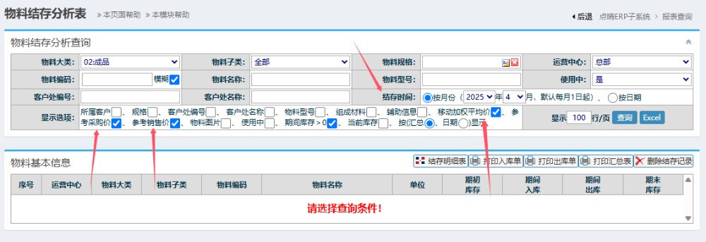 统计当前实时库存金额在:ERP系统-》报表查询-》物料结存分析表 页面,在此页面上可以查询到以往各个月份的库存结存数据。