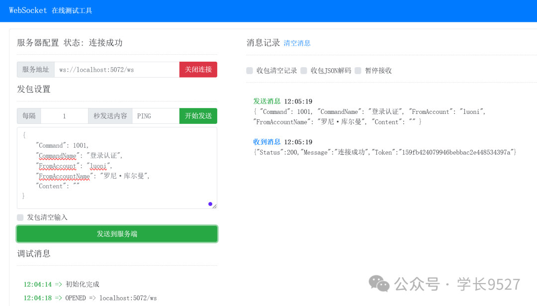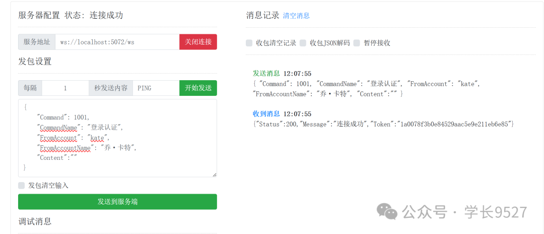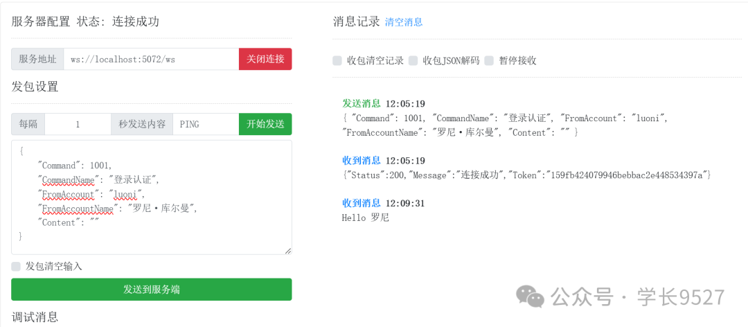 输入ws://localhost:5072/ws测试地址,点击开启连接,提示连接成功后可以开始测试