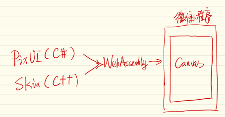 原理比较简单,如下图所示,将C#写的PixUI应用及C++写的Skia引擎编译为WebAssembly,然后通过微信小程序的WXWebAssembly加载,并在canvas(WebGL)通过skia绘制出用户界面,监听微信小程序的事件传给C#处理后重新绘制界面。