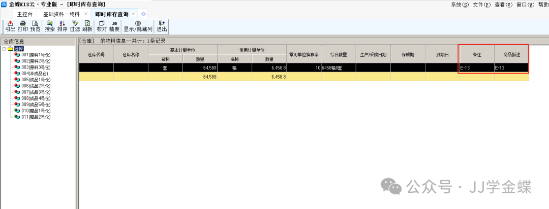 在金蝶KIS云·专业版的标准功能中,并未直接提供仓位管理的功能。然而,近期通过与客户的交流,我意外发现了一个巧妙的解决方法。在金蝶KIS云·专业版的物料属性中,有两个名为“备注”和“商品描述”的字段。这两个字段填写的内容能够自动同步到即时库存表中。基于这一特性,我们可以在“备注”或者“商品描述”字段中填入仓位信息,从而轻松实现仓位管理。