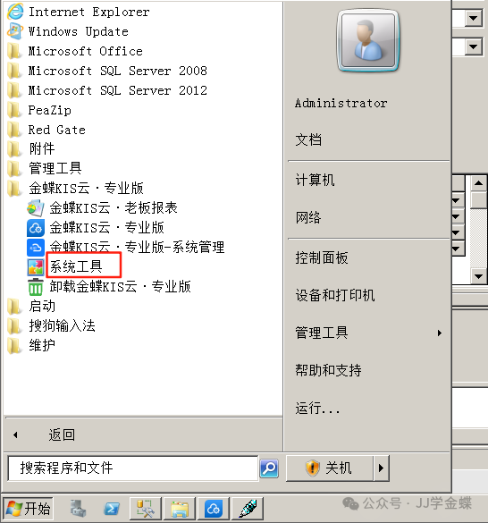 1、在【开始】-【所有程序】-【金蝶KIS云·专业版】点击【系统工具】;