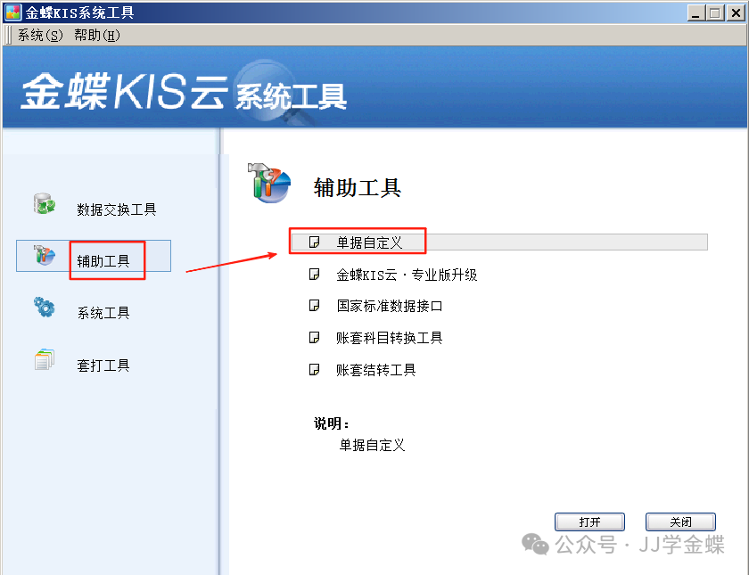 2、在【系统工具】-【辅助工具】里点击【单据自定义】;