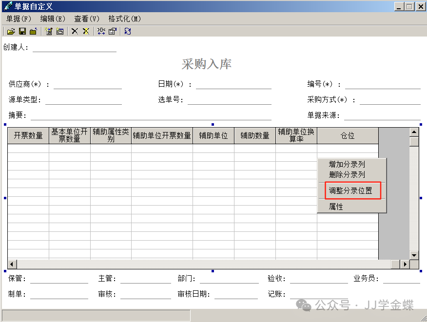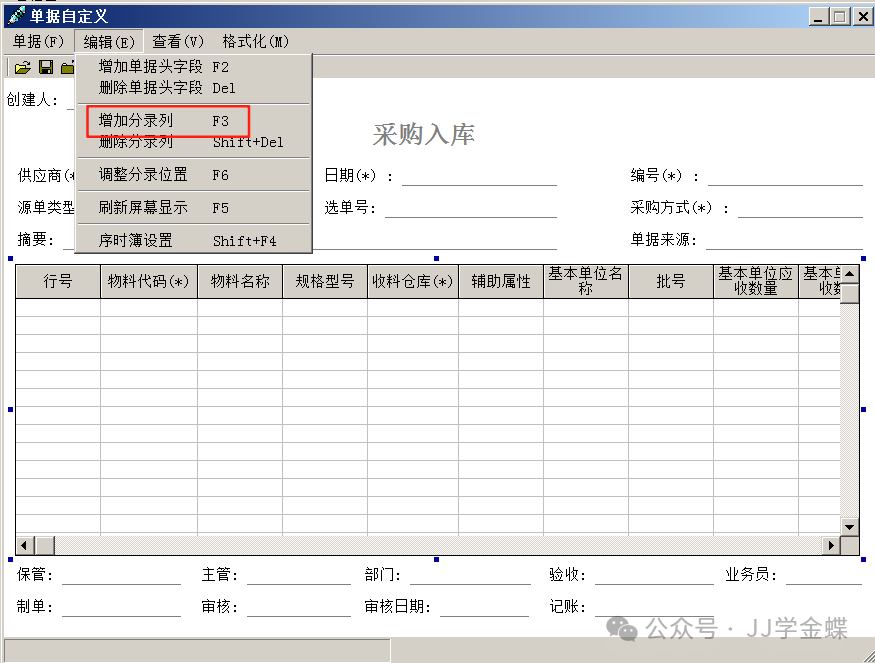 下面以采购入库单为例(其他出入库单据操作类似),详细介绍添加分录列的操作步骤: