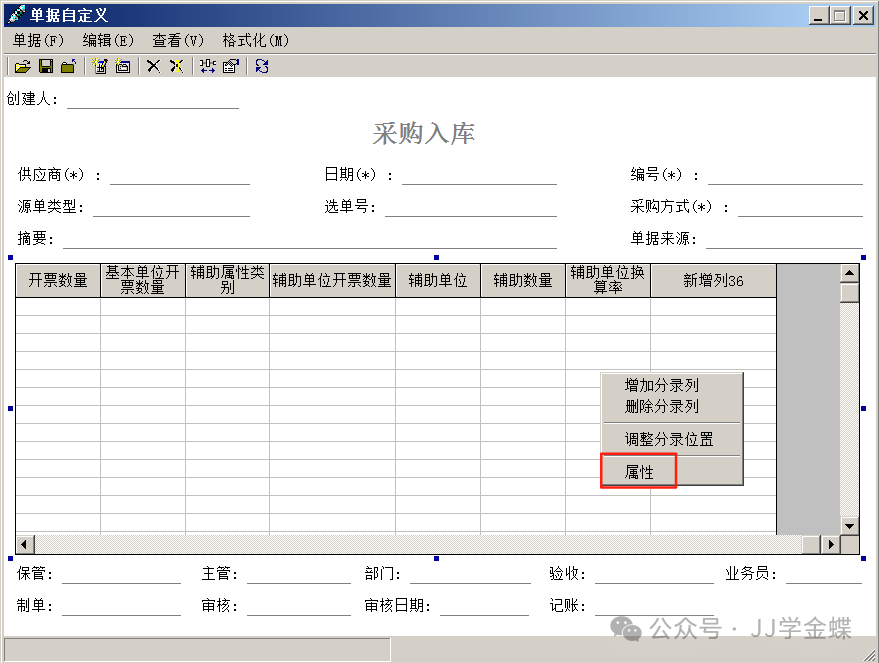 a、在采购入库单表体鼠标右键点击“属性”,找到新增的分录列;