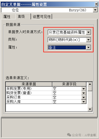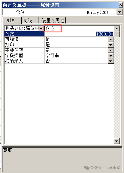 c、在“仓位”分录列的“高级”属性页签设置取数来源,如果仓位写在“商品描述”字段,也可以将“属性”改成“商品描述”;
